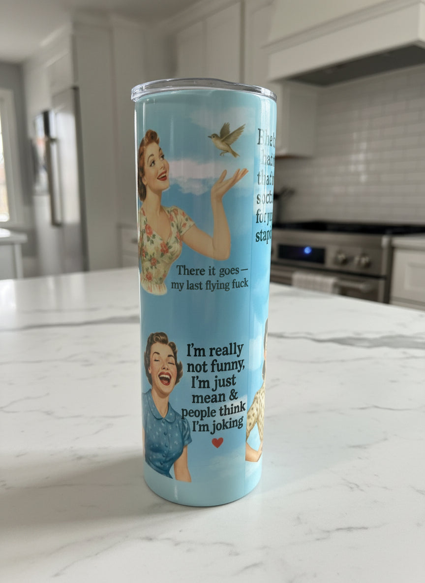 Sip your favorite drink with a little attitude! This 20 oz stainless steel tumbler features a humorous retro-inspired design with a 1950s-style woman and bold, sarcastic phrases that say exactly what you’re thinking—so you don’t have to.