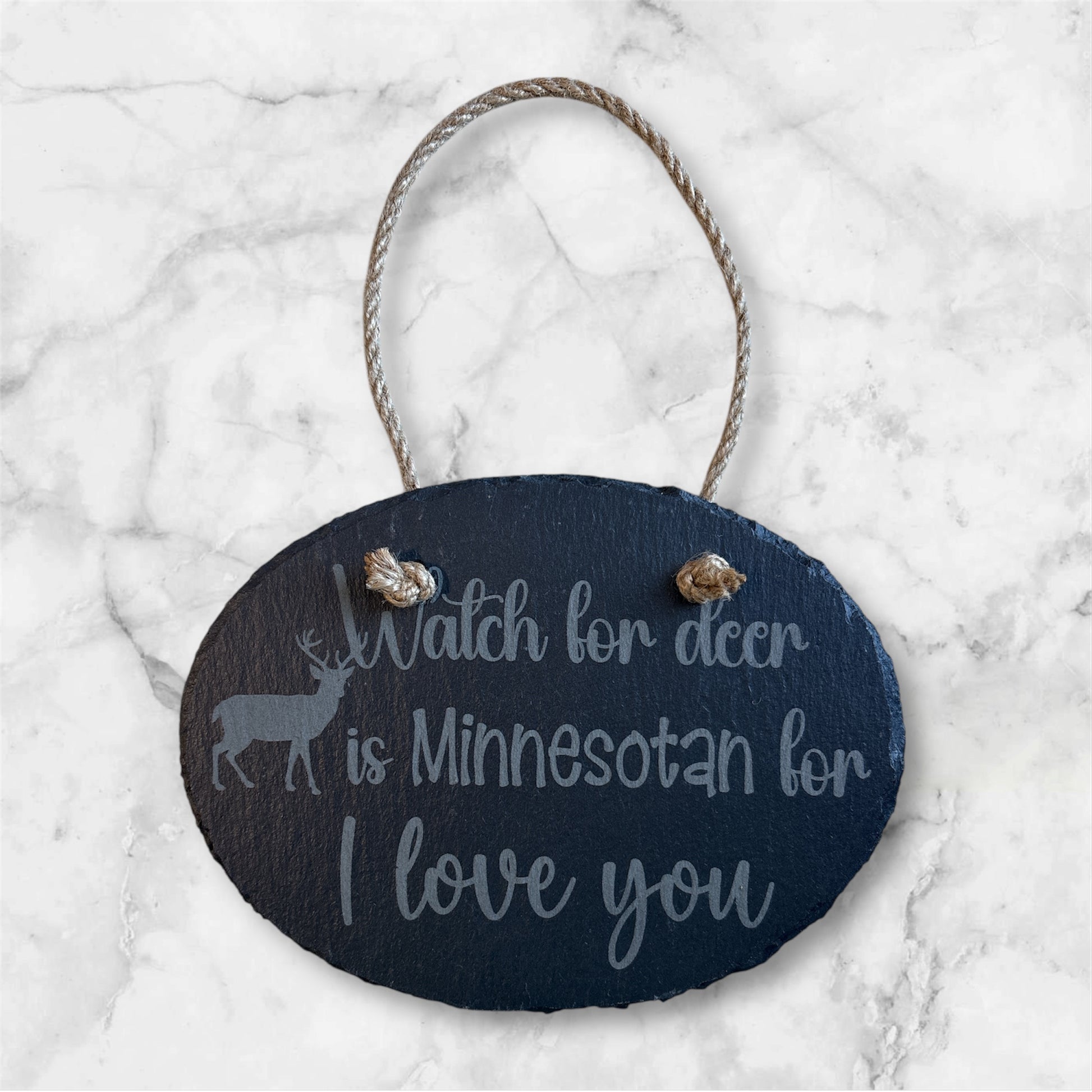 Bring a perfect touch of Minnesota charm to your home or cabin with this handcrafted engraved slate wall hanging. Featuring the beloved phrase, “Watch for deer is Minnesotan for I love you,” this piece blends humor, warmth, and Midwest tradition—making it a meaningful décor item or gift for anyone who loves the Northwoods. Comes ready for gift giving, bubble wrapped in a box.